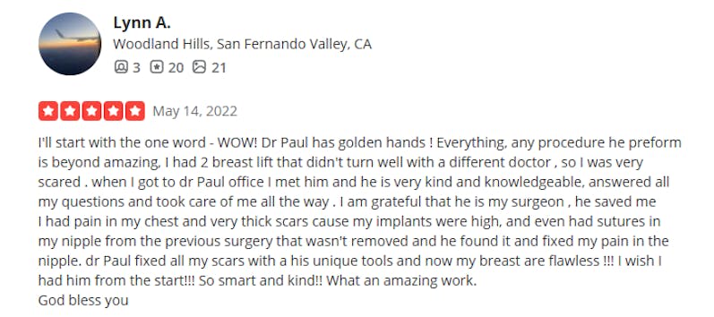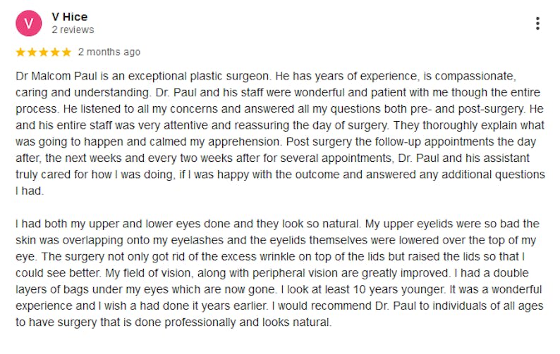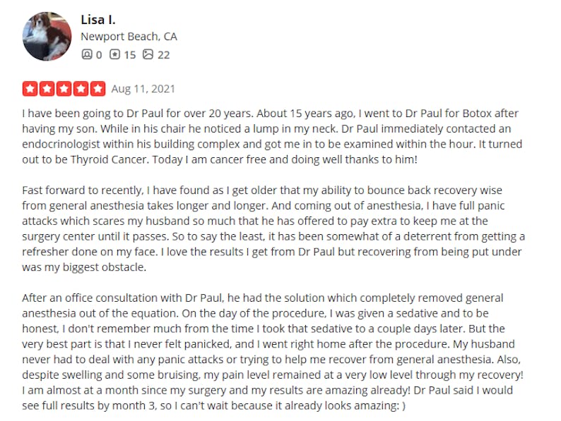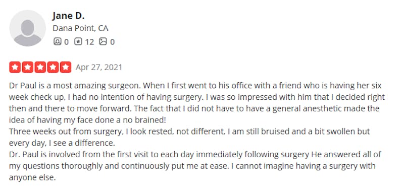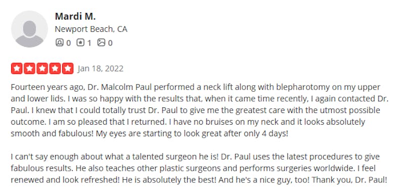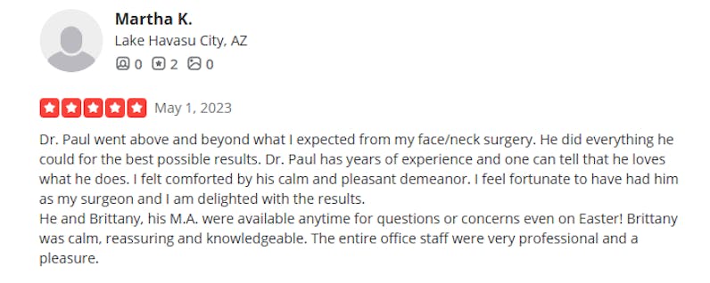 “Dr. Paul performed my original facelift 14 years ago — and I just came back for a small touch-up. That tells you everything you need to know about how long his work lasts. He’s truly an artist.”